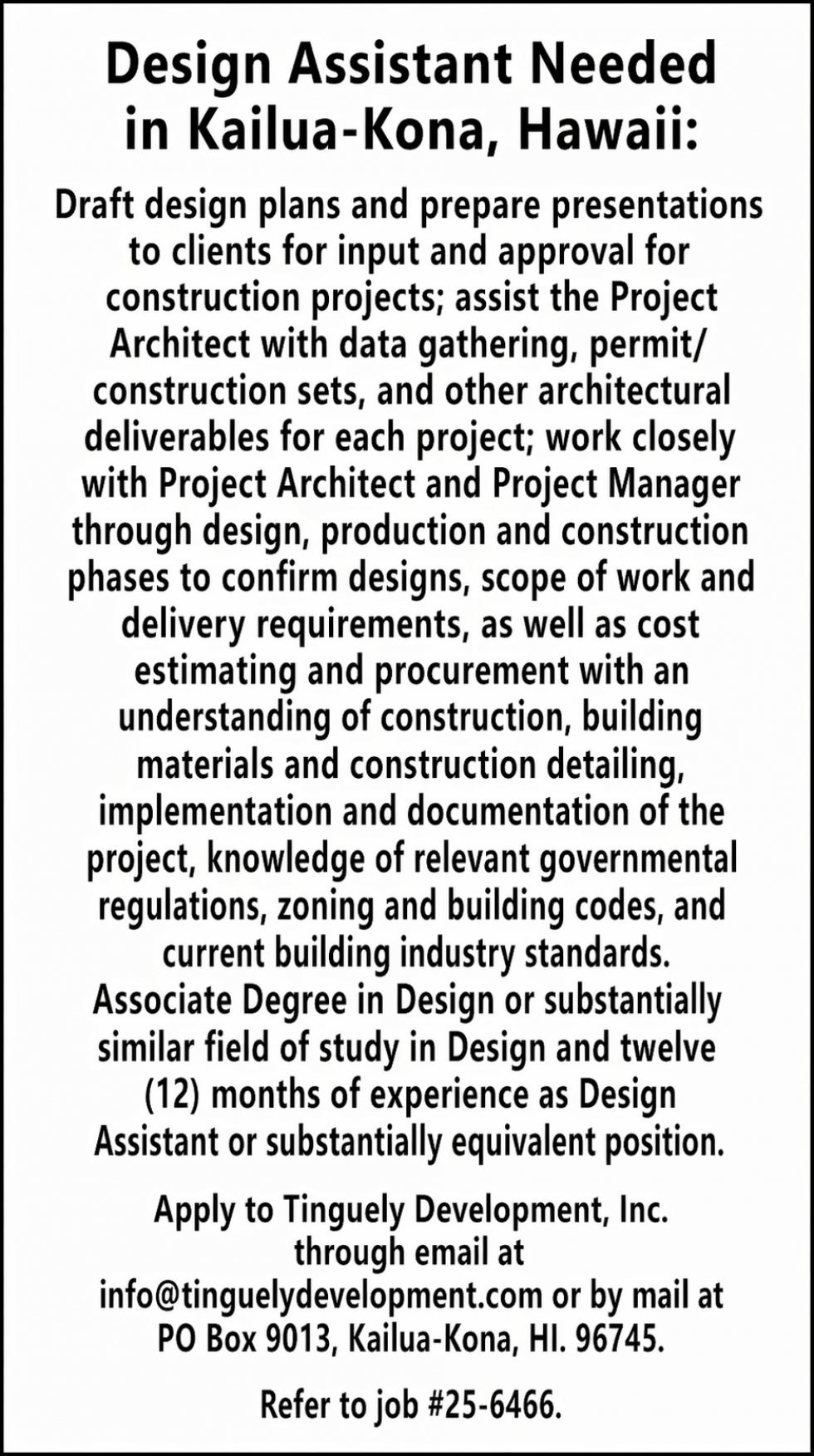 Apr 24, 2026. Tinguely Development, Inc. General Jobs from West Hawaii Today Jobs
